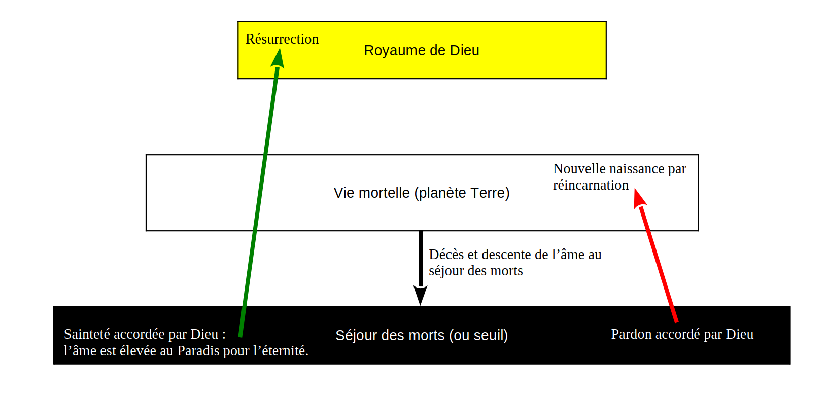 Les morts ayant atteint la sainteté par l’exemplarité de leur existence, brisent le cycle des re-naissances et accèdent à la vie éternelle. Dieu réserve un autre sort à celles et ceux qui ne sont pas parvenus à être sanctifiés. Leur mémoire est effacée. Ils retournent sur Terre sous la forme de bébés reformatés aux paramètres initiaux… Et tout recommence.